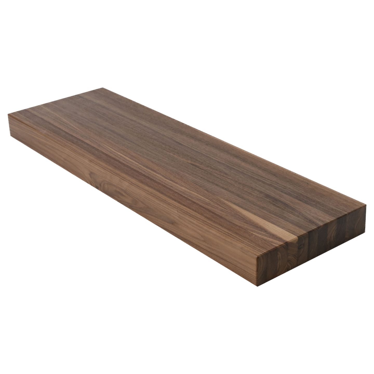 At a refined 2.5" thick, the tread is constructed from solid Walnut strips laminated edge-to-edge, revealing a tight, linear grain pattern across the full walking surface. This construction method is not only visually distinctive — it produces a tread that is structurally rigid and exceptionally stable underfoot. A 1/8" roundover on every edge completes the refined, finished look. The 2.5" profile offers a precise balance between visual weight and restraint — substantial enough to anchor the staircase, understated enough to let the butcher block's texture and grain carry the design.
