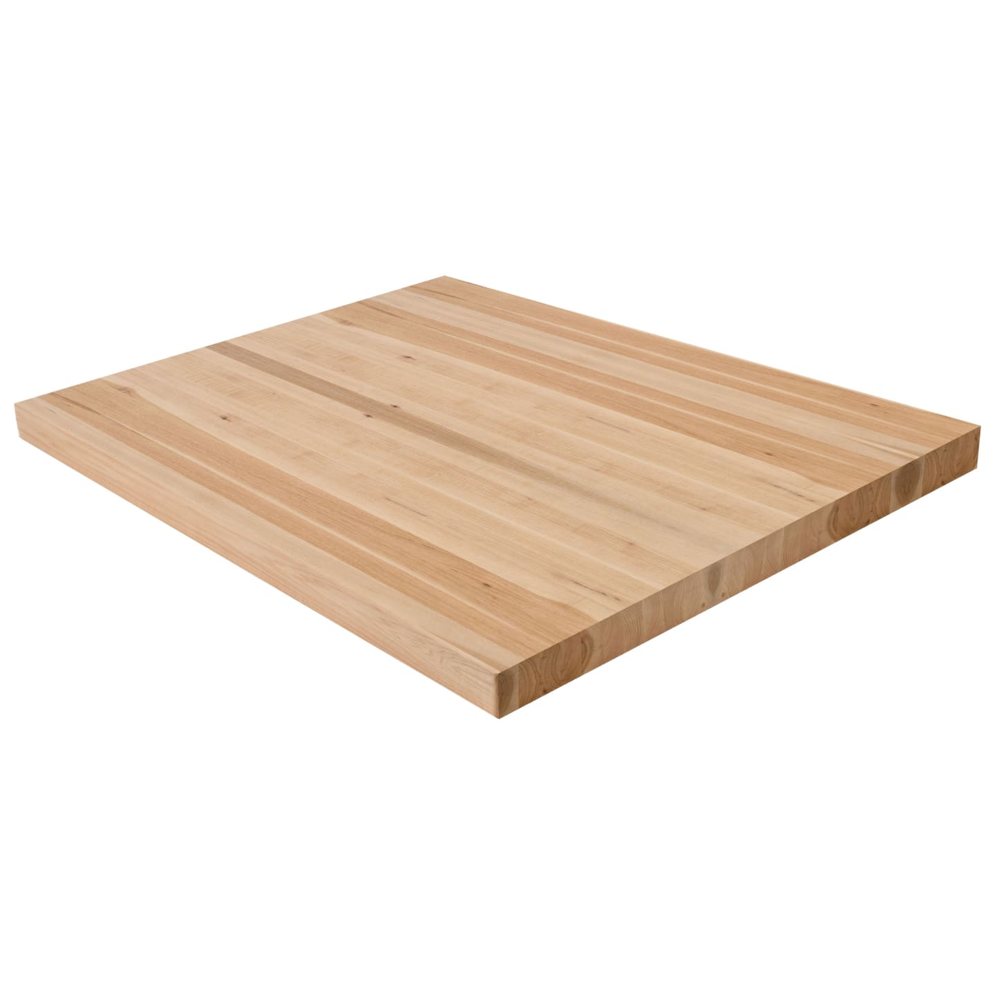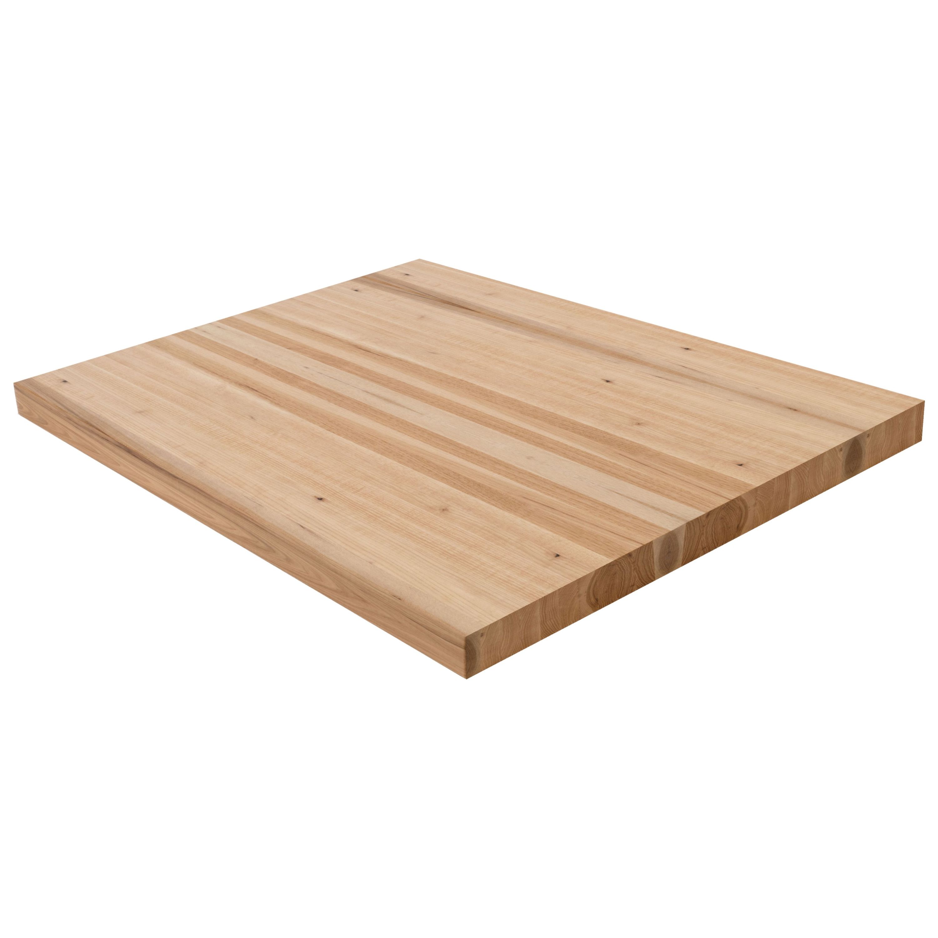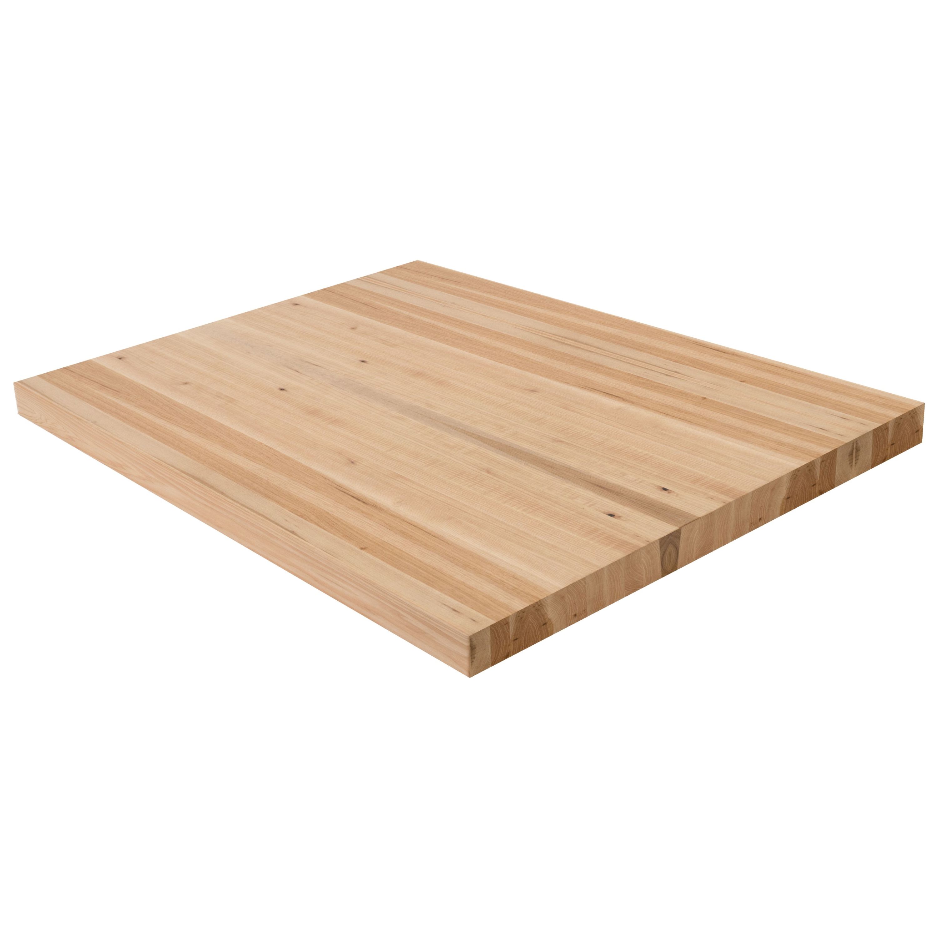 Make a clean, modern statement with the 2" Hickory Butcher Block Landing Platform. Solid 5/4 boards are glued face-to-face to build up a full 2" thickness, so you're looking at the beautiful face grain-never the edge-on every surface. Each of the 6 sides is sanded smooth and finished to your specifications, with a refined 1/8" roundover on every edge. Hickory is the hardest and most character-rich domestic hardwood in our lineup, with a Janka rating of 1,820. Its dramatic color variation-ranging from pale cream sapwood to deep reddish-brown heartwood-delivers a bold, one-of-a-kind look on every landing. Hickory's natural knots and swirling grain patterns make it ideal for rustic, farmhouse, or eclectic stair designs where personality and toughness matter most. Available in standard sizes of 36" x 36", 42" x 42", and 48" x 48"-or specify a custom size. Choose unfinished to apply your own stain or clear coat, or select a pre-finished option for a ready-to-install landing platform. Matching stair treads are available to complete your staircase. Note: at 2" thickness, a landing pan or supporting structure beneath the landing is recommended for optimal rigidity.