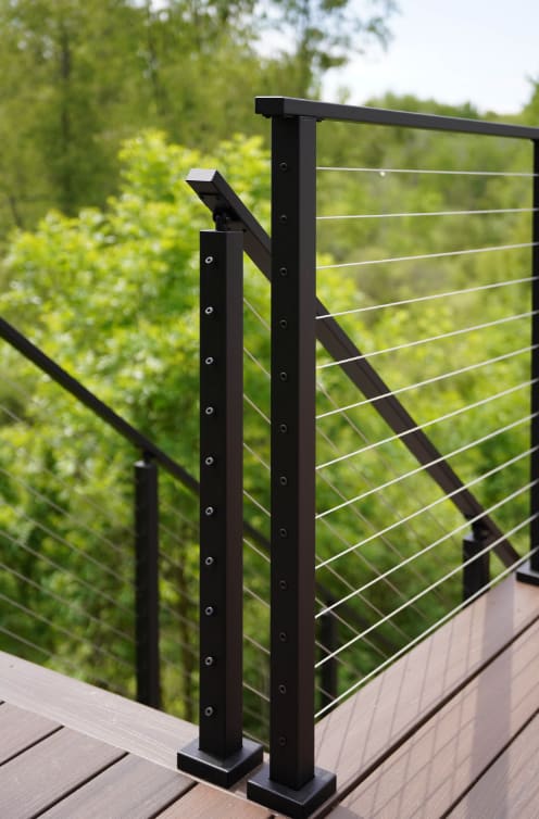 This Express Cable Railing Angle End Post is installed at the termination of Express cable stair runs.