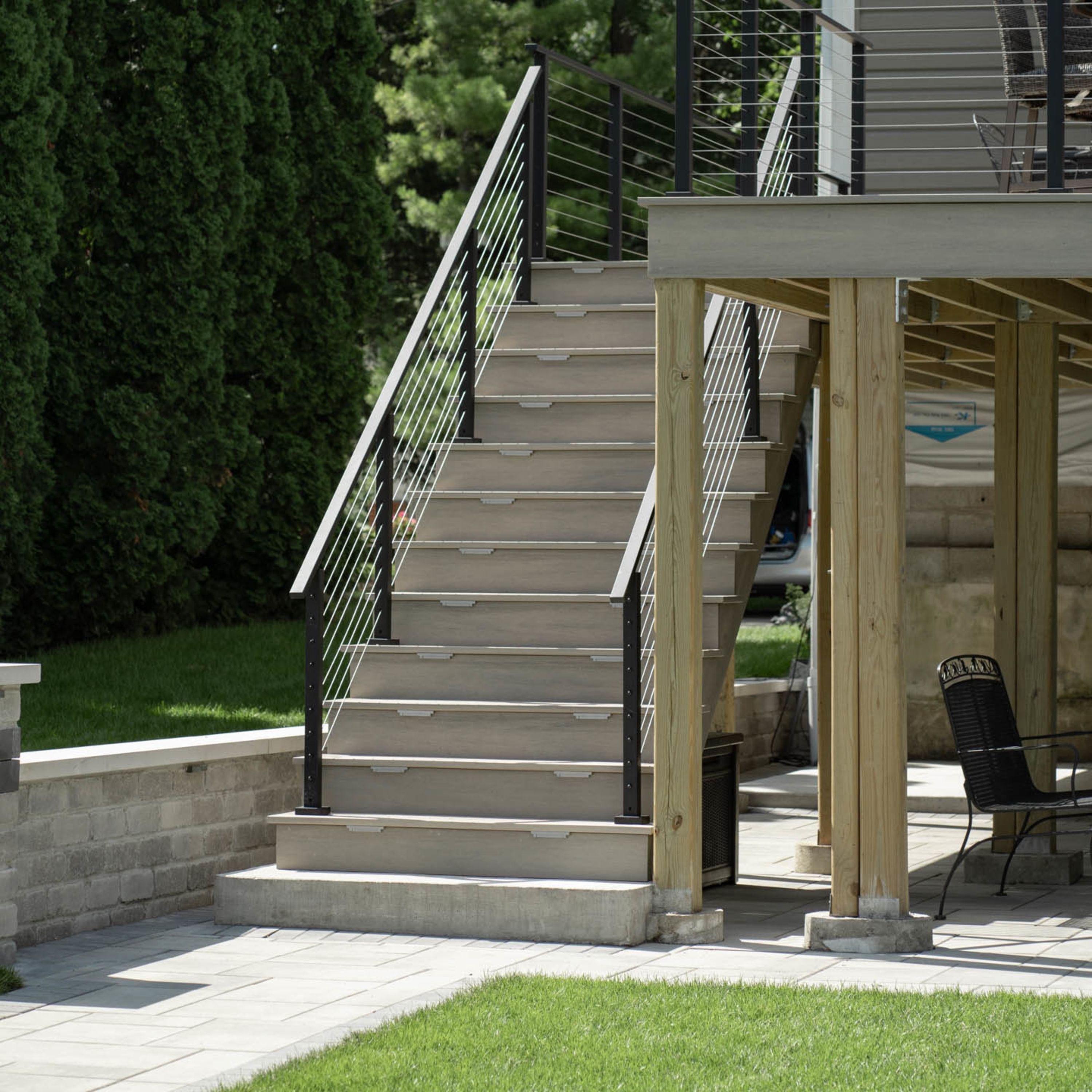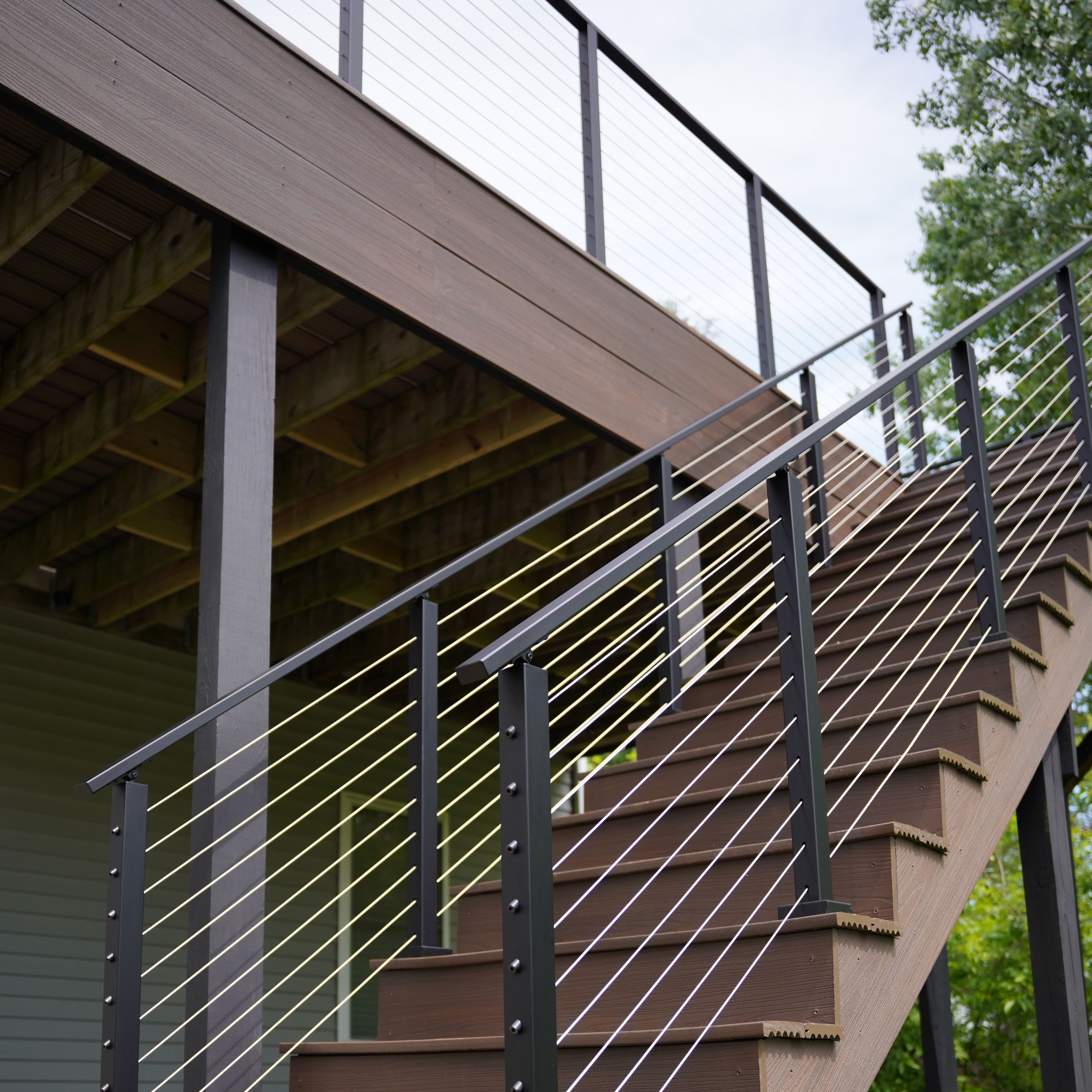 All‑in‑one bundle — posts, handrail, cable, and hardware packaged for one stair run.