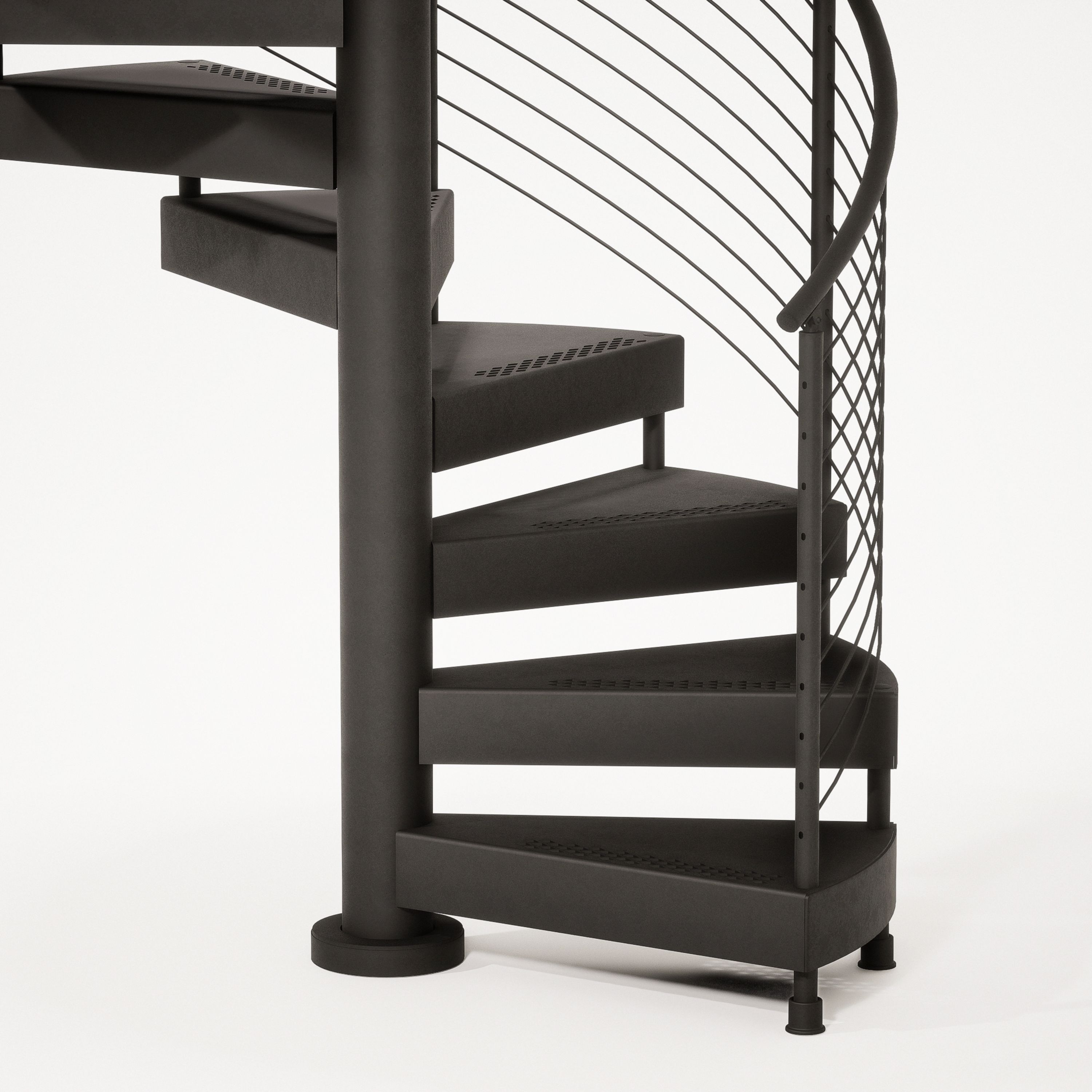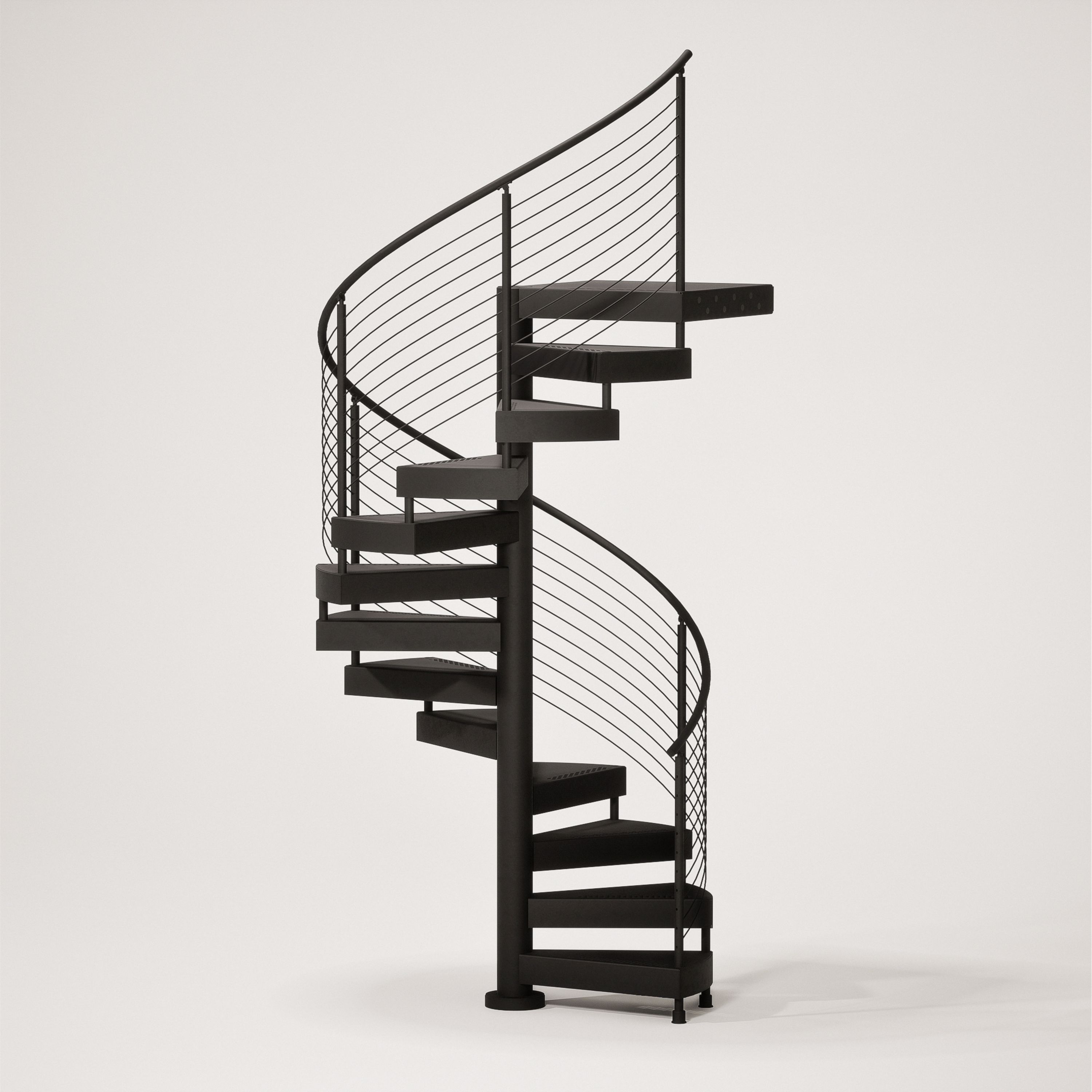 The FLIGHT Spiral Exterior stair system is designed for stunning outdoor applications, featuring a sleek, center-post helical design that adds modern elegance to any deck or patio. Built with durable materials, it withstands the elements while maintaining its aesthetic appeal. This space-saving option provides a beautiful and functional vertical connection for exterior spaces.
