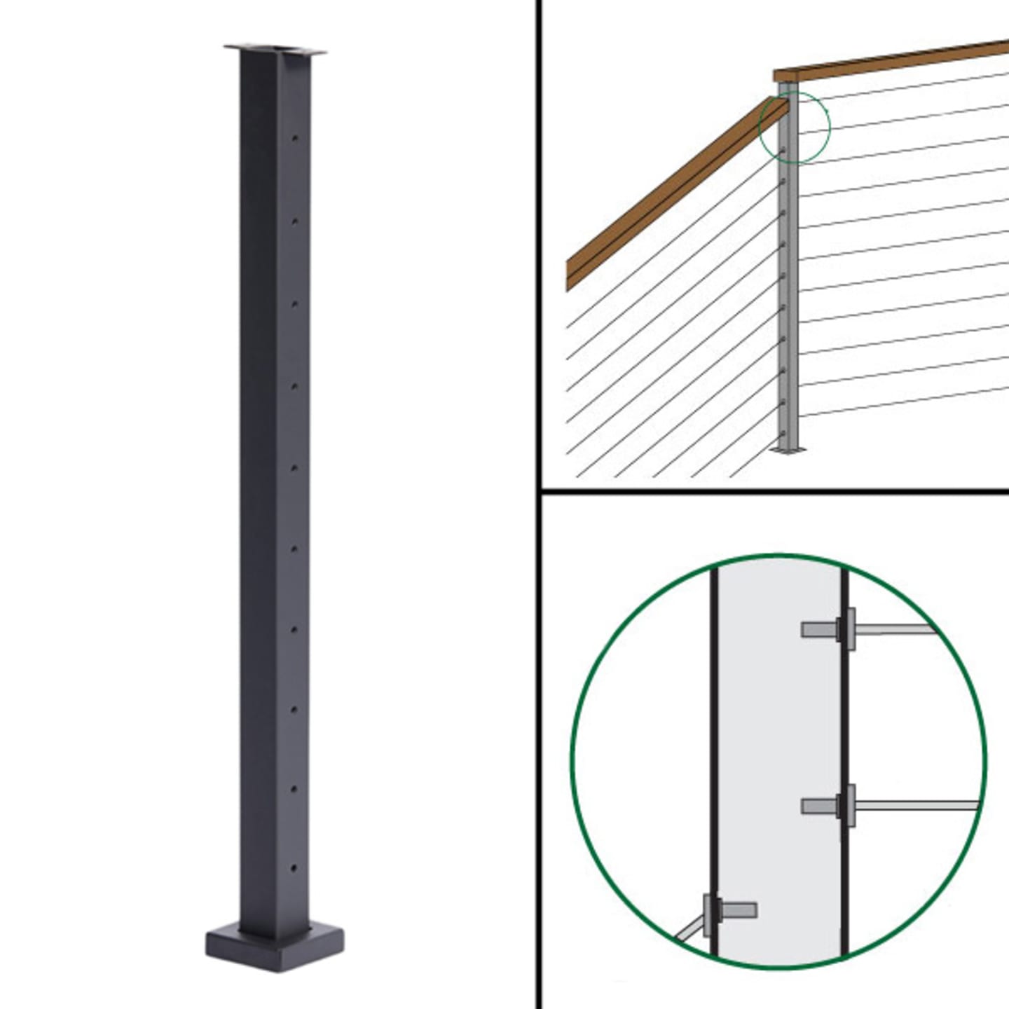 “H” – The “H” post is designed to transition from 36″ tall stair section to a 39″ or 42″ level balcony section. It has 10, 5/16″ offset* holes drilled on opposite sides of the posts, in addition it has one (39″) or two (42″) 5/16″ holes drilled at the top of the high side of the post. Recommended fittings: “Adhesive Sleeve” (20 sleeves) & “Inside Post Mount Kits” (39″ – 1 kit, 42″ – 2 kits). Additional hardware: The Postside Handrail Bracket will make transitioning this handrail much easier.