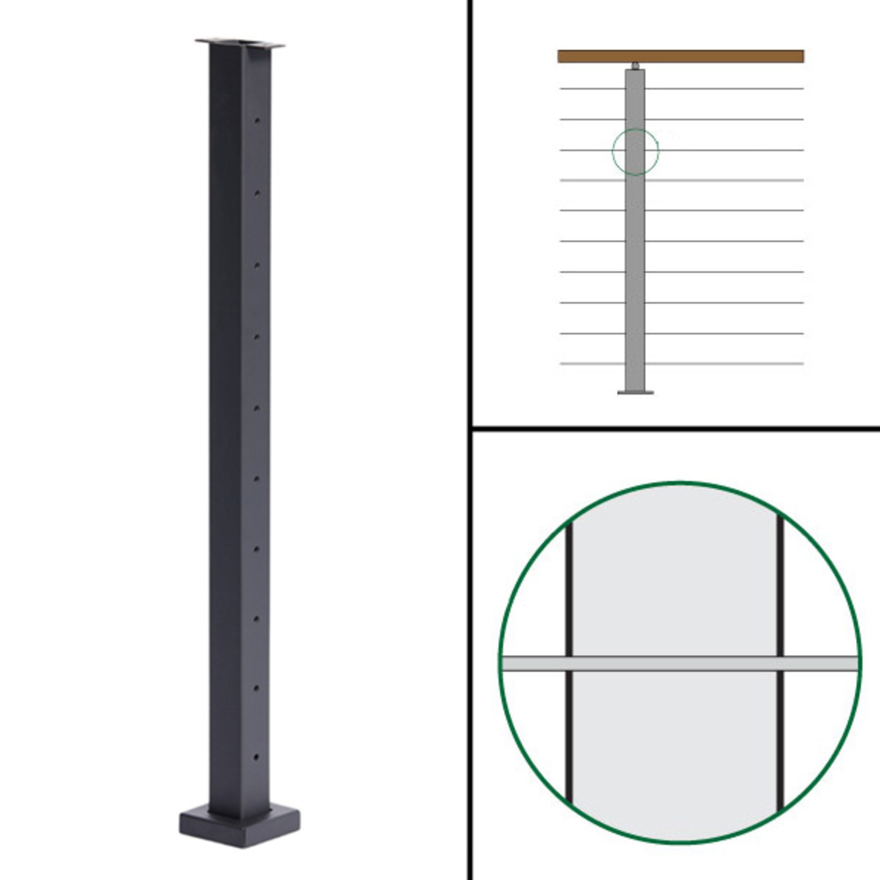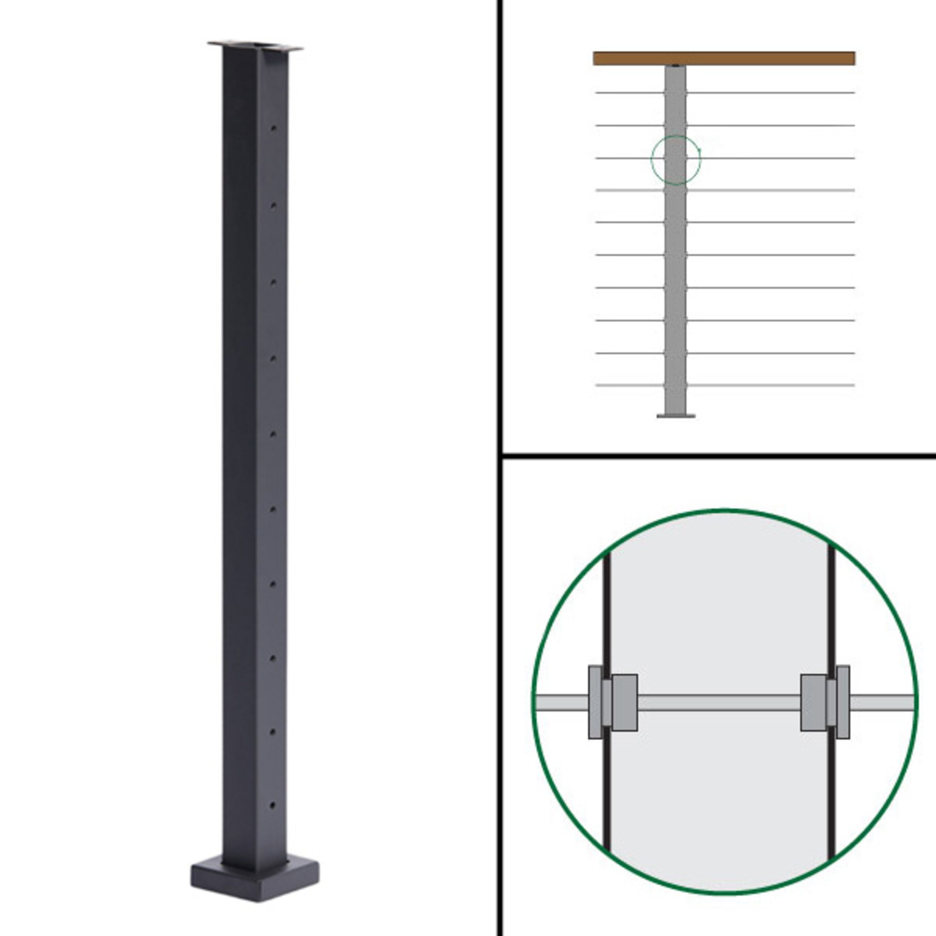 The Signature Cable Railing, Surface Mount, Flat Top Level Passthrough Post “A-5” is the intermediate post for level runs. Pre-drilled with level 5/16″ holes on both sides, cable passes cleanly through the post without any additional fittings or hardware – keeping installation fast and the finished look clean.