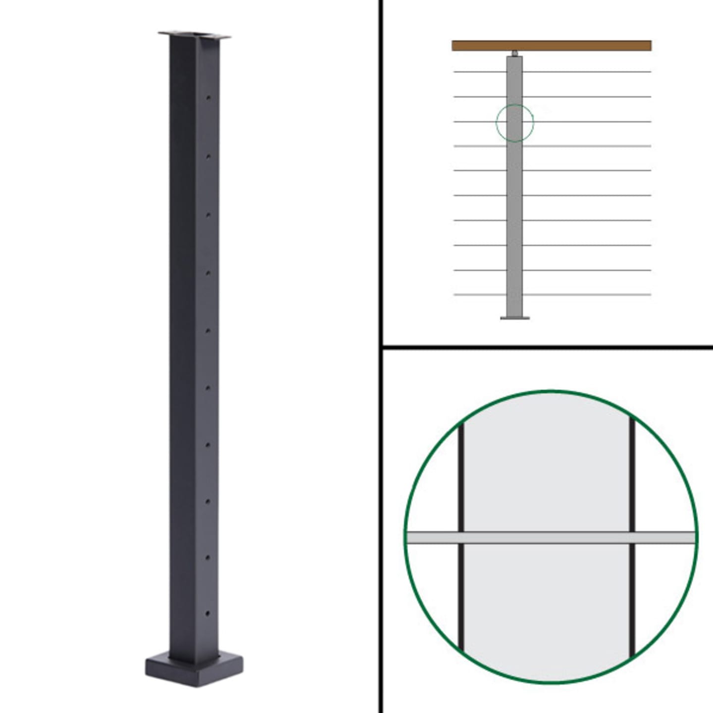 “A-5” – The “A-5″ post is designed to be an intermediate post on level runs. It has level 5/16” holes drilled on both sides of the post. The cable will simply pass directly through the post, no additional fittings are required.