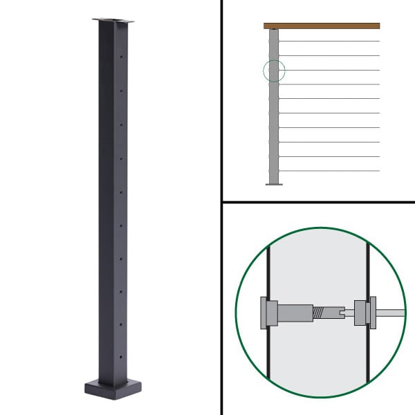 “A” – The “A” post is designed to be a start or end post on level runs. It has level 1/2″ holes drilled on both sides of the post. Recommended fittings: “Level Tension Kits” (36″ – 10 kits, 39″ – 11 kits, 42″ – 12 kits).