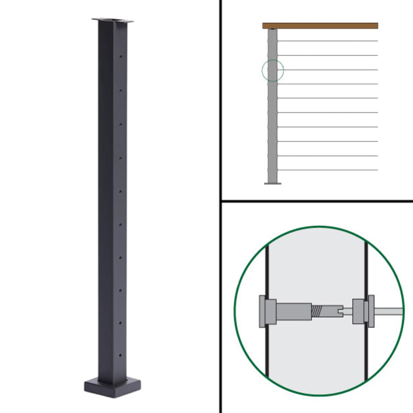 “A” – The “A” post is designed to be a start or end post on level runs. It has level 1/2″ holes drilled on both sides of the post. Recommended fittings: “Level Tension Kits” (36″ – 10 kits, 39″ – 11 kits, 42″ – 12 kits).