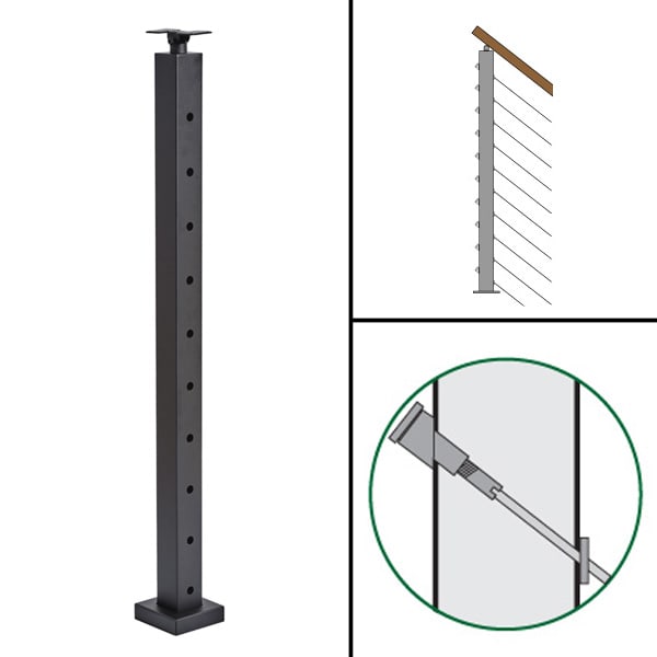 B” – The “B” (Up or Down) post is designed to be a start or end post on angled stair runs. It has 1/2″ holes drilled on one side of the post, and 5/16″ holes offset and drilled on the other side of the post. Recommended fittings: “Angle Tension Kits” (36″ – 10 kits, 39″ – 11 kits, 42″ – 12 kits). The “Up” or “Down” options refer to the direction the cable will be travelling when it exits the post.