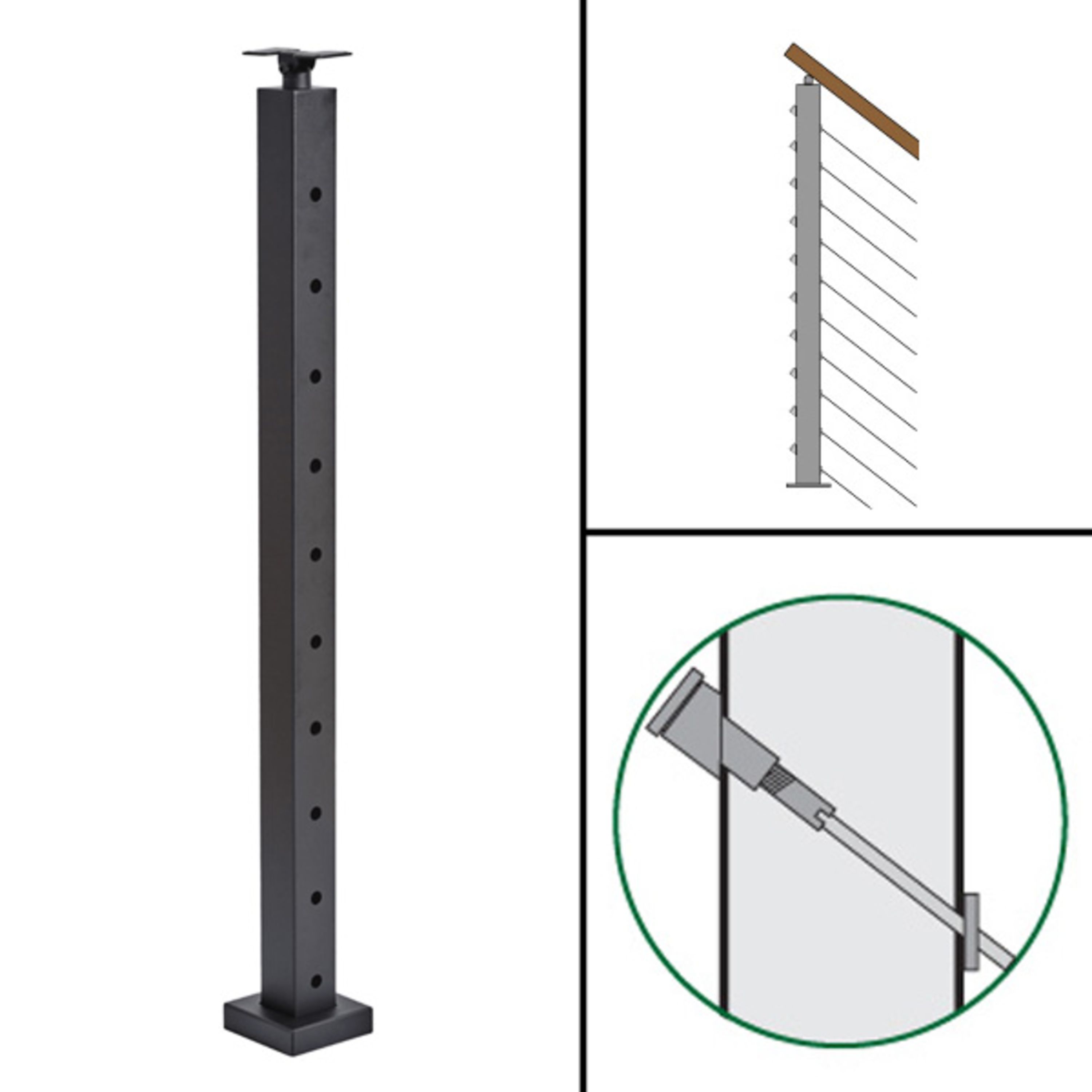 The Signature Cable Railing, Surface Mount, Universal Top Angle Tension Post “B” is the start and end post for angled stair runs. Drilled with 1/2″ holes on one side and 5/16″ offset holes on the other to match the pitch of the stair, it uses Angle Tension Kits to anchor and tension each cable run. Available drill angles: 25°, 30°, 35°, 37° (standard), or 40°. Kits needed: 36″ – 10 kits, 39″ – 11 kits, 42″ – 12 kits.