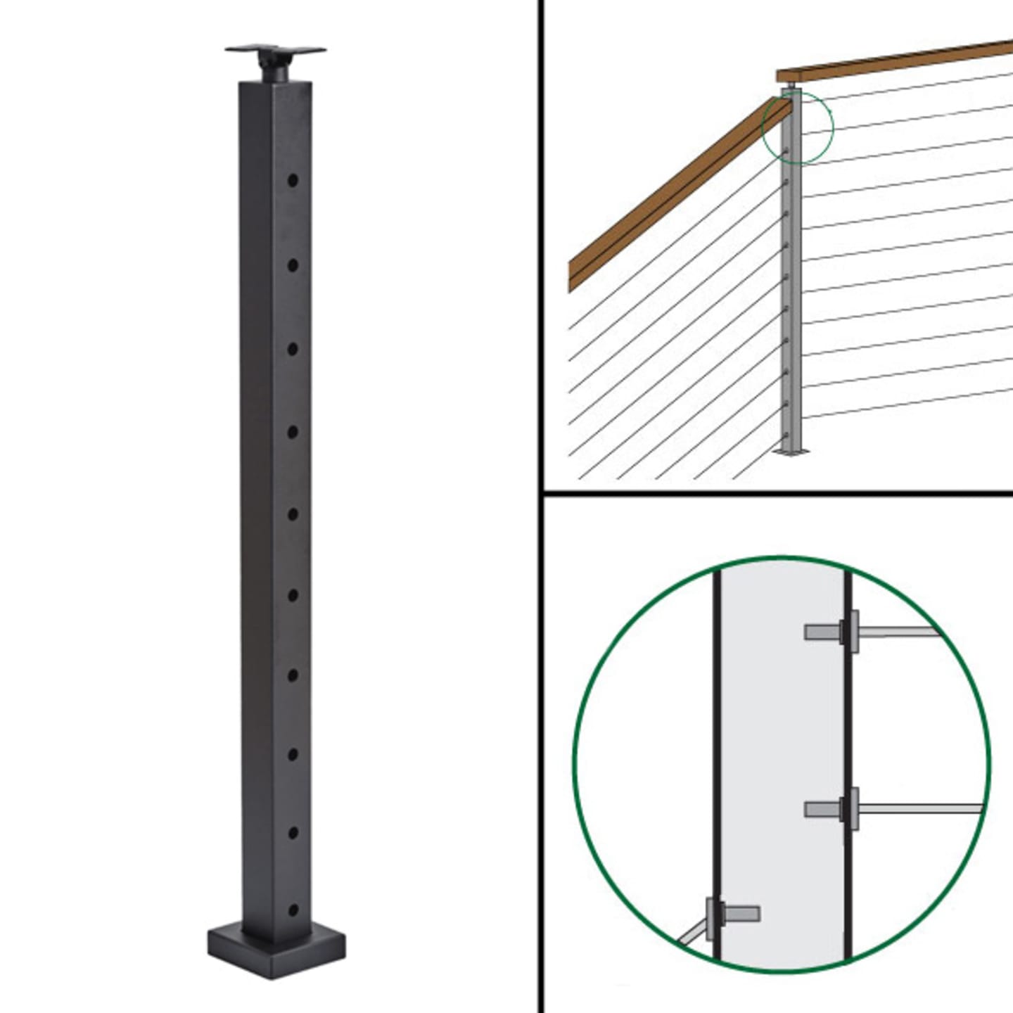 “H” – The “H” post is designed to transition from 36″ tall stair section to a 39″ or 42″ level balcony section. It has 10, 5/16″ offset* holes drilled on opposite sides of the posts, in addition it has one (39″) or two (42″) 5/16″ holes drilled at the top of the high side of the post. Recommended fittings: “Adhesive Sleeve” (20 sleeves) & “Inside Post Mount Kits” (39″ – 1 kit, 42″ – 2 kits). Additional hardware: The Postside Handrail Bracket will make transitioning this handrail much easier.