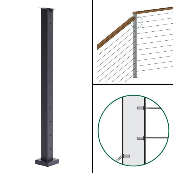 “H” – The “H” post is designed to transition from 36″ tall stair section to a 39″ or 42″ level balcony section. It has 10, 5/16″ offset* holes drilled on opposite sides of the posts, in addition it has one (39″) or two (42″) 5/16″ holes drilled at the top of the high side of the post. Recommended fittings: “Adhesive Sleeve” (20 sleeves) & “Inside Post Mount Kits” (39″ – 1 kit, 42″ – 2 kits). Additional hardware: The Postside Handrail Bracket will make transitioning this handrail much easier.