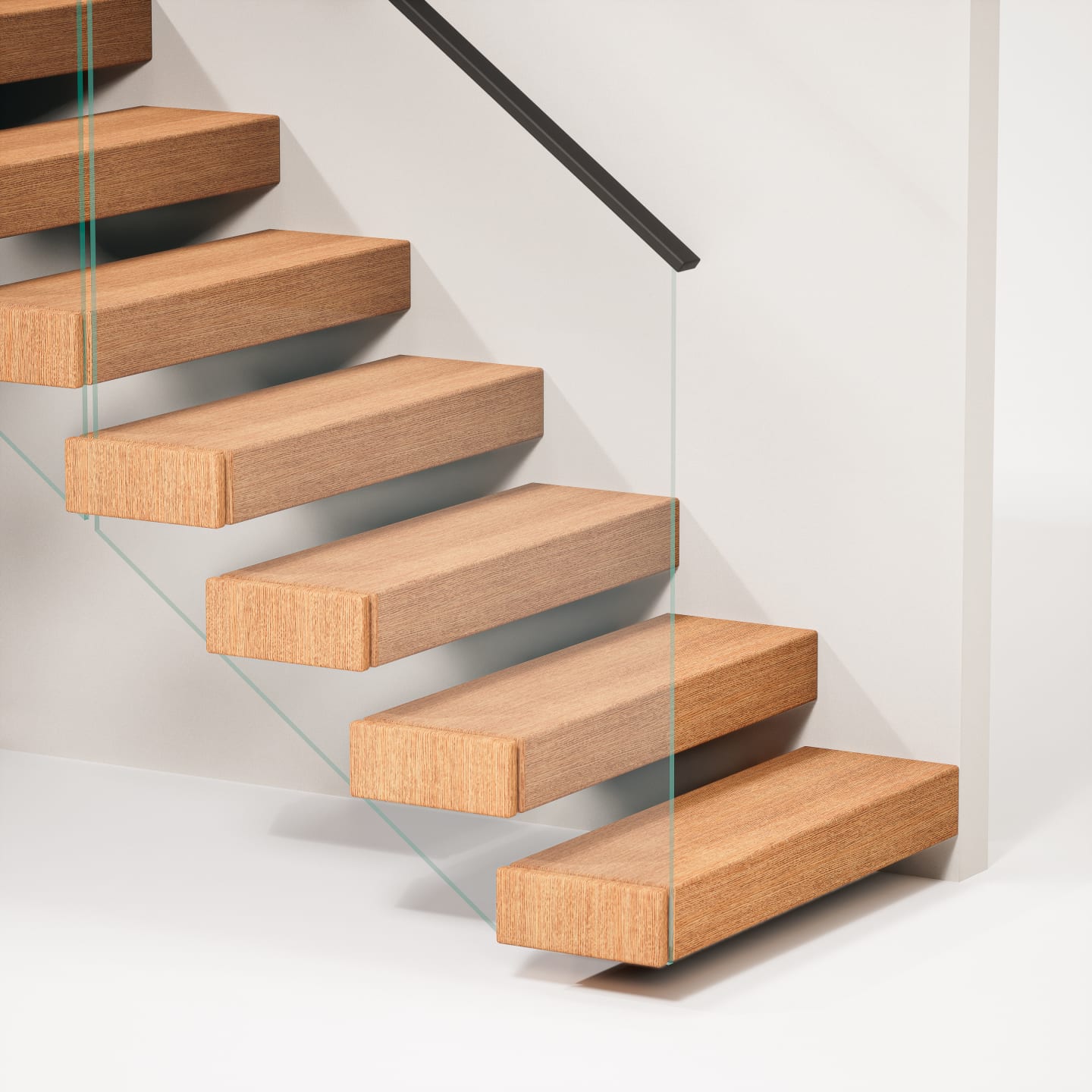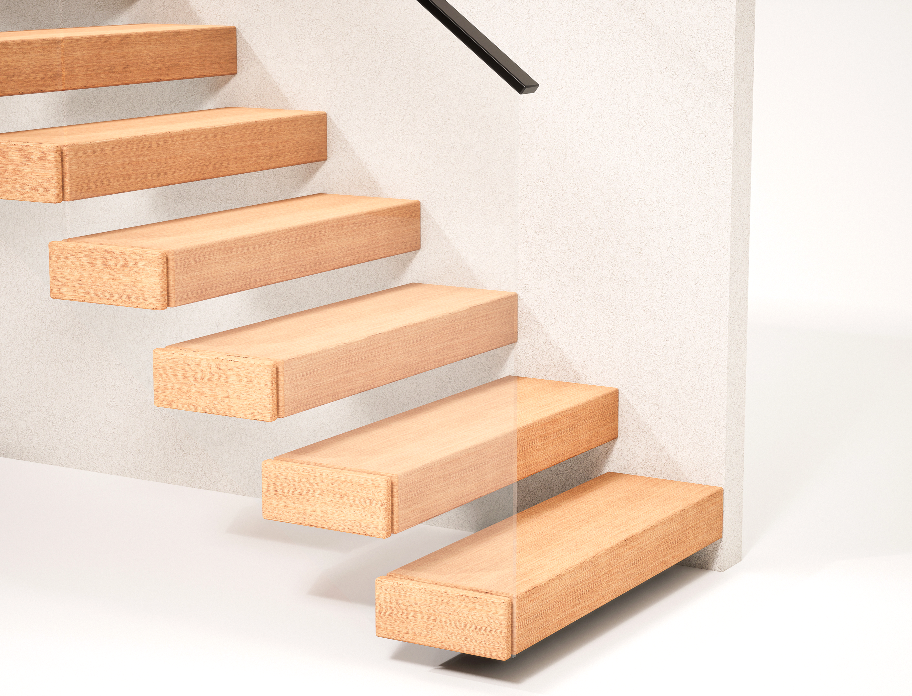 The FLIGHT Cantilever floating stair system is custom-engineered to create the striking look of treads appearing to “float” directly from the wall. Each tread is securely anchored to a hidden steel support system, delivering exceptional strength while preserving a clean, minimalist aesthetic.
