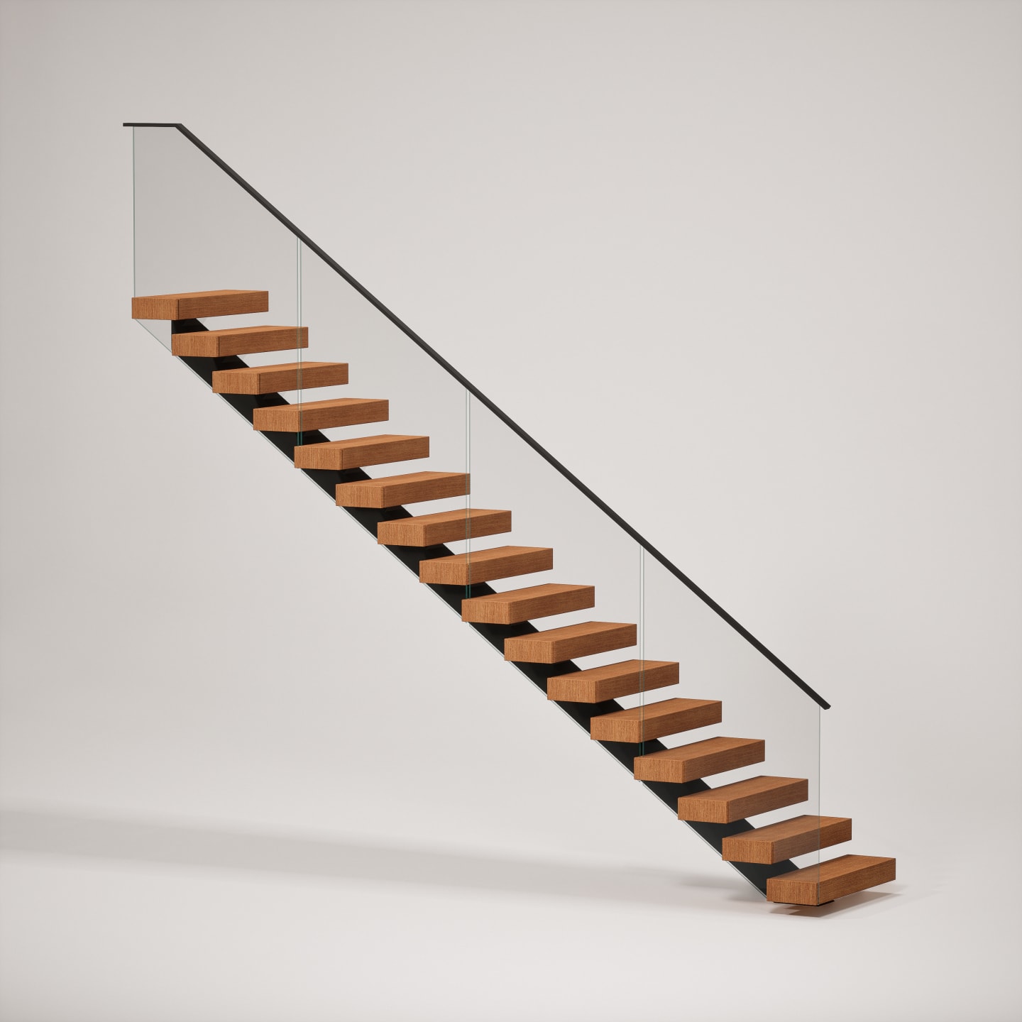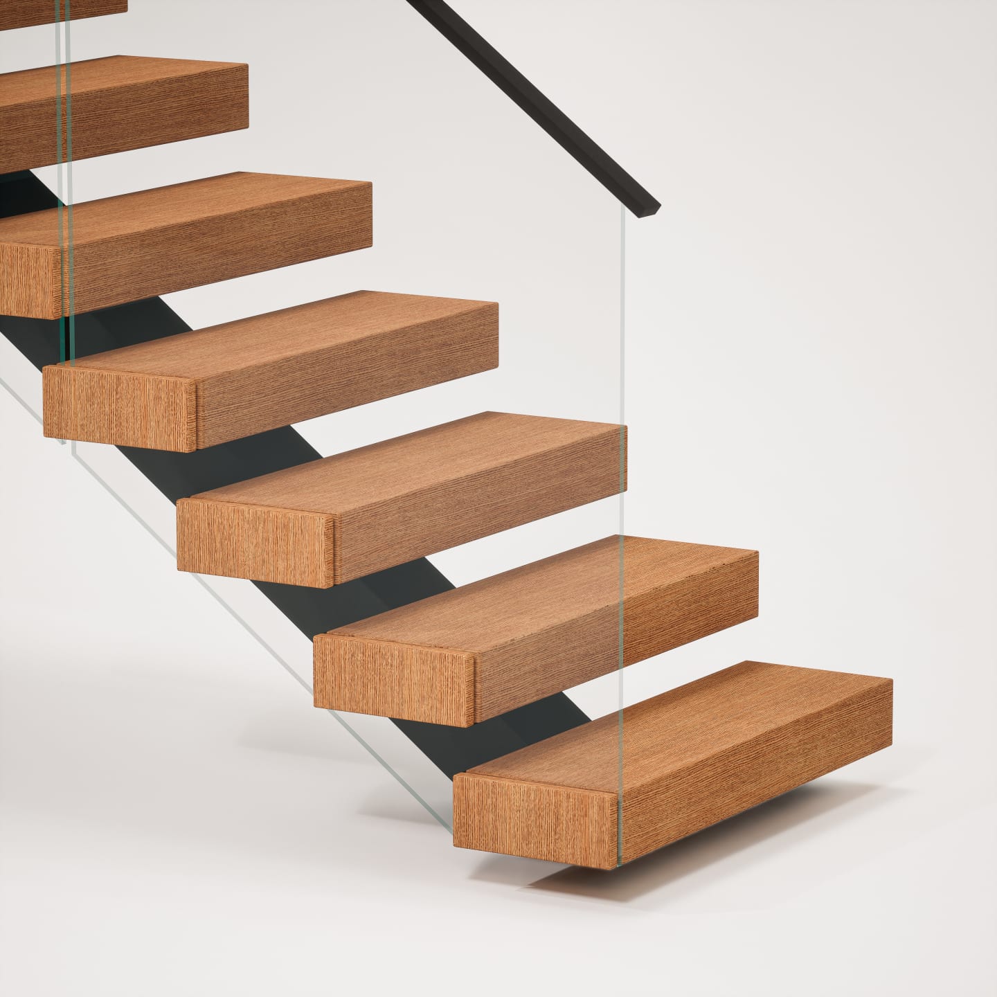 The FLIGHT Mono floating stair system is custom-manufactured to your exact specifications, with every detail carefully engineered for precision, strength, and style. From the 6" x 8" mild steel stringer—built to meet IRC regulations—to the CNC-routed pockets in the treads that lock perfectly onto fixed-angle brackets, each element is designed to fit seamlessly.